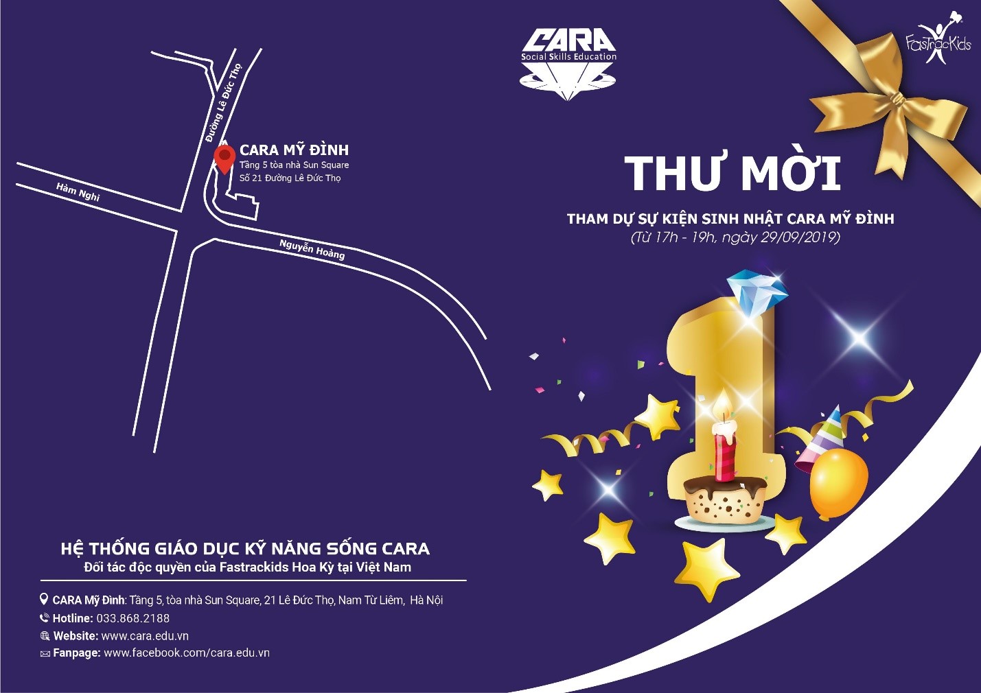 Hệ thống giáo dục kỹ năng sống Cara trân trọng kính mời các bậc phụ huynh cùng tất cả các bạn nhỏ từ 4 – 10 đến tham dự bữa tiệc sinh nhật 1 tuổi của Cara Mỹ Đình từ 17h – 19h, Chủ Nhật ngày 29 tháng 09 năm 2019 tại Trung tâm giáo dục kỹ năng sống Cara Mỹ Đình, tầng 5, tòa nhà Sun Square, 21 Lê Đức Thọ, Nam Từ Liêm, Hà Nội.