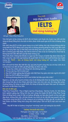 Thấu hiểu được những băn khoăn, lo ngại này thì Công ty cổ phần Tập đoàn Giáo dục Trí Việt cùng Học viện Anh ngữ Sydney tổ chức buổi hội thảo trực tuyến mang tên: “IELTS – tấm vé thông hành mở rộng tương lai” vào ngày Chủ nhật, 12/12/2021.