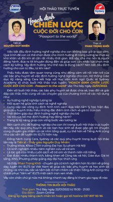 Bên cạnh chủ đề hướng nghiệp cho con thì trong buổi Hội thảo trực tuyến lần này, các quý phụ huynh và các bạn học sinh sẽ được gặp gỡ, trò chuyện cùng chuyên gia nhằm có cái nhìn tổng quát, cụ thể hơn về Tiếng Anh cũng như các vấn đề luyện thi IELTS hiện nay.