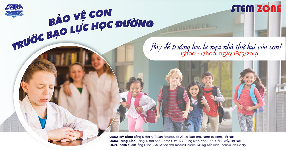 Hệ thống giáo dục kỹ năng sống Cara thông báo tổ chức sự kiện trải nghiệm MIỄN PHÍ với chủ đề “Bảo vệ con trước bạo lực học đường” dành cho học sinh từ 4-9 tuổi. Sự kiện hứa hẹn sẽ mang lại kiến thức hữu ích và kỹ năng sống trẻ em cho cả phụ huynh và học sinh để bảo vệ bản thân trước bạo lực học đường.