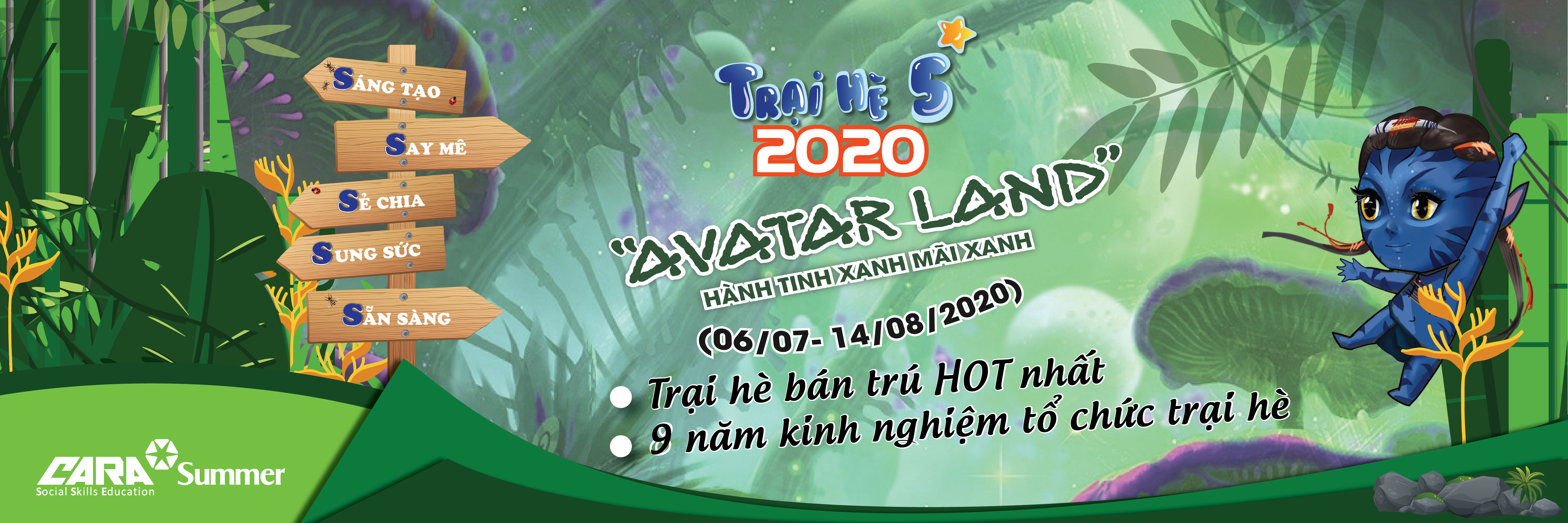 Trại hè bán trú 5* Avatar Land là chương trình trại hè diễn ra trong vòng 8 tuần với mục tiêu mang đến cho học sinh một kỳ nghỉ hè vừa bổ ích, vừa lý thú, kết hợp 4 yếu tố: Kỹ năng, thể chất, nghệ thuật và dã ngoại trải nghiệm.
