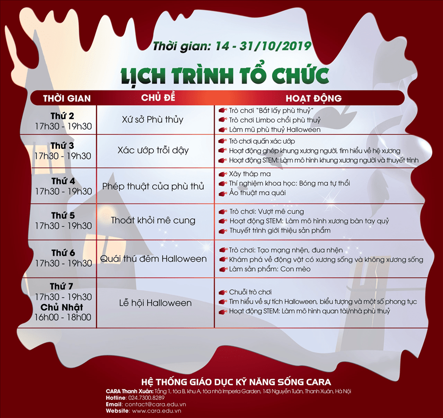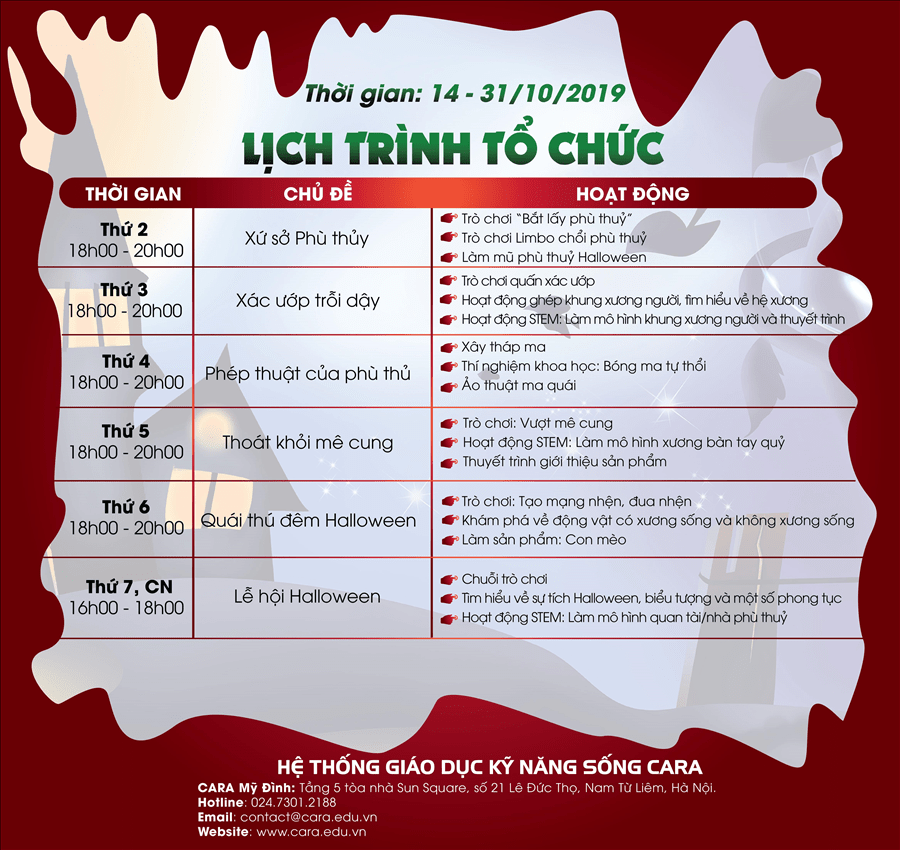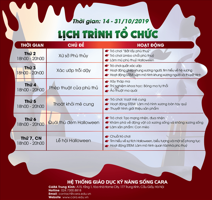 Bố mẹ đừng bỏ lỡ và hãy nhanh chóng đăng kí cho con tham gia vào Lễ hội Halloween để bé được hòa mình với các bạn đồng trang lứa, cùng Cara khám phá lễ hội đầy náo nhiệt kết hợp phát triển các kỹ năng cần thiết cho trẻ với phương pháp giáo dục kỹ năng sống hiện đại phù hợp với từng độ tuổi.